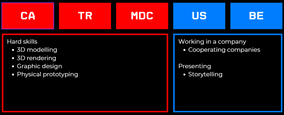 Secondly, with upcoming courses, I aim to further elaborate on and improve on my technical skills. Through courses like, Designing connected experiences, Intelligent Interactive product design and Design Actuated Systems, I hope to apply my technical skills and get develop new knowledge within TR and MDC. Within my FBP, I also aim to apply technical skills learned in my B3.1 internship.