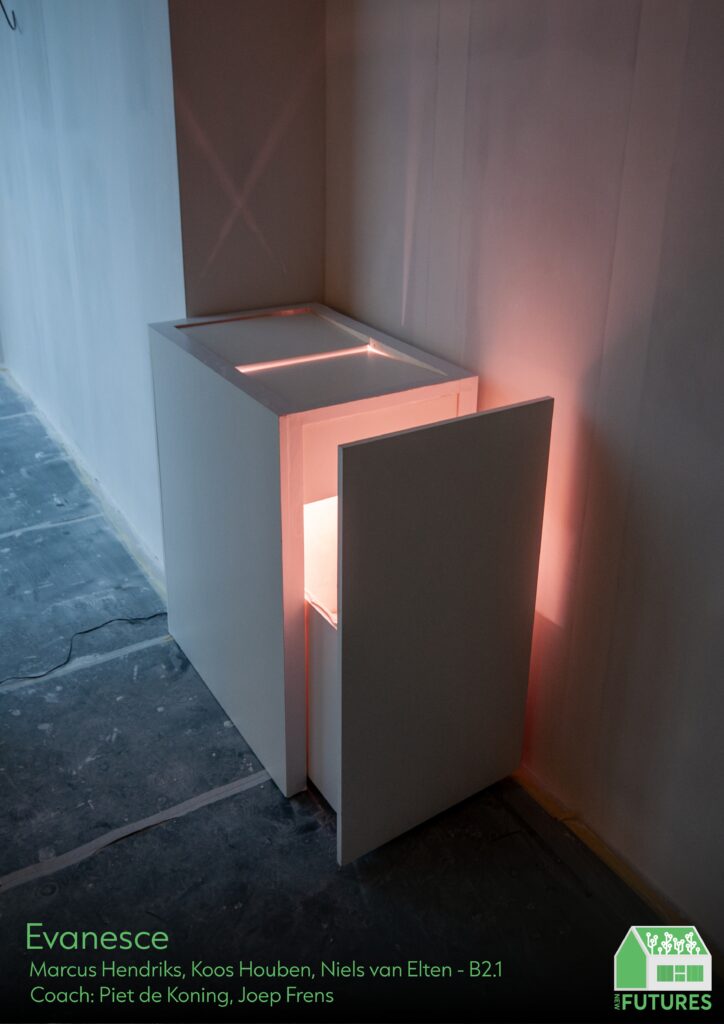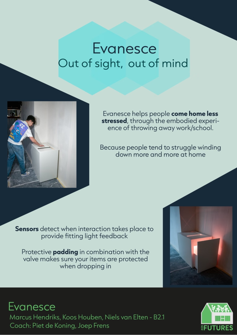 Evanesce helps people transition from their work or school to home life and relieve stress through the embodied experience of throwing away your work or school. Designed for the future home. During this project, I developed several expertise areas. In CA I practiced visual storytelling and ideation through sketching and prototyping, while also exploring BE through branding and logo design. Our user research into the “feeling of home” contributed to my development in US, shaping our concept around the transition from work life to home life. Personally, I learned the value of structured planning and reflection, coordinating my group with weekly to-do lists and reminders, while also maintaining motivation and a positive team atmosphere. I gained experience in video editing, which broadened my creative toolset. Although I missed a chance to explore sound design in this project, I gained valuable experience in designing for an experience, something I can translate to future festival or event contexts.