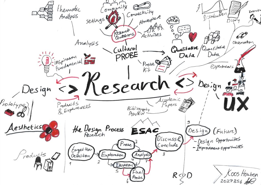 In the Design <> Research course, I explored how design research methods, especially cultural probes, can generate qualitative insights into abstract topics like atmosphere and community. The course places “research” at the center, emphasizing its role as both a foundation and inspiration for design. Through development and deployment of a cultural probe for the ESAC community, I learned to formulate effective research questions, collect qualitative data, and conduct thematic analysis to uncover patterns and themes. The course sharpened my analytical skills and helped me understand how research can form design opportunities. I also reflected on the Design Research (DR) process, comparing it with other design models like Design Thinking [1] and the Double Diamond [2]. I discovered that although the DR process differs in its focus, the reoccurring factors within the design processes are iterative loops. I realized that implementing DR methods, like cultural probes, into projects could strengthen the user understanding and lead to more targeted designs. This course taught me the value of integrating structured, qualitative research into early design stages to uncover user needs and create more meaningful, context-sensitive design outcomes.